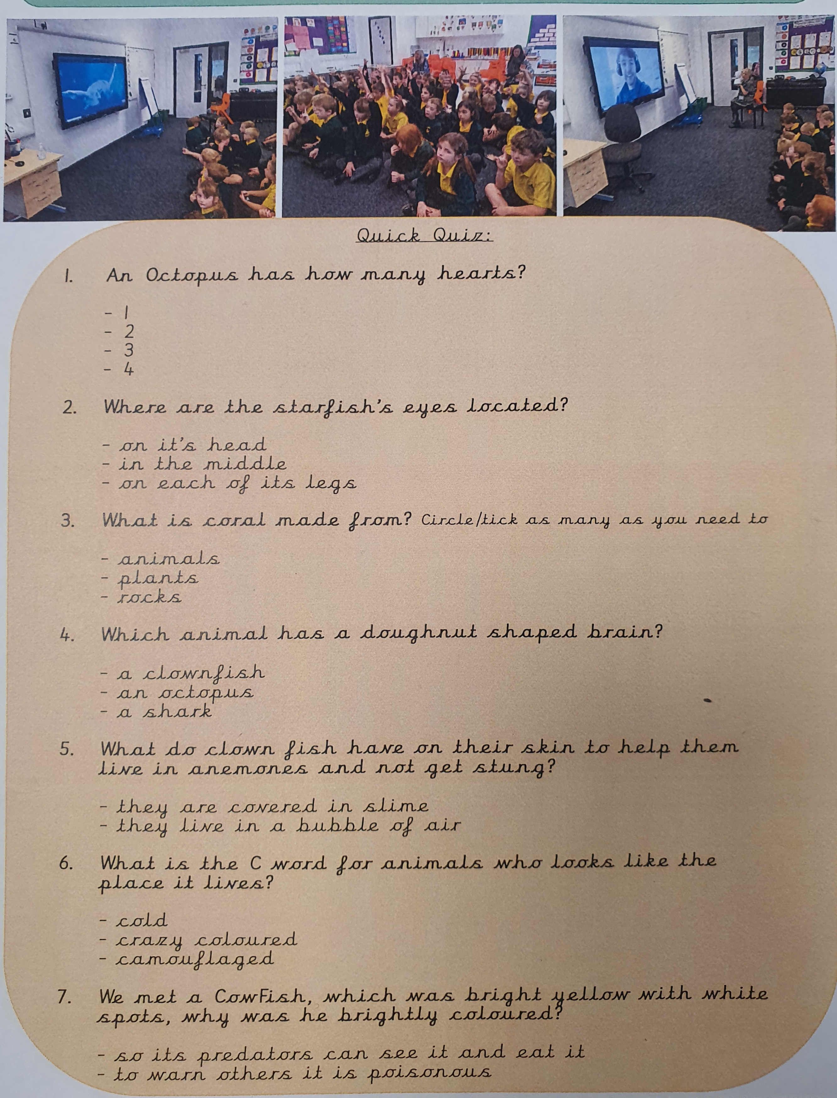 Today we went on a virtual tour of the National Marine Aquarium in Plymouth! After meeting Joe, our guide, we toured the entrire aquarium, visiting all of the exhibits; from deep ocean, to coral reef! We were most excited about meeting a lemon shark, feeding Noodle the Octopus, and spotting the single Lionfish in amongst all of the Coral. Have a look at our virtual quiz – can you answer correctly?