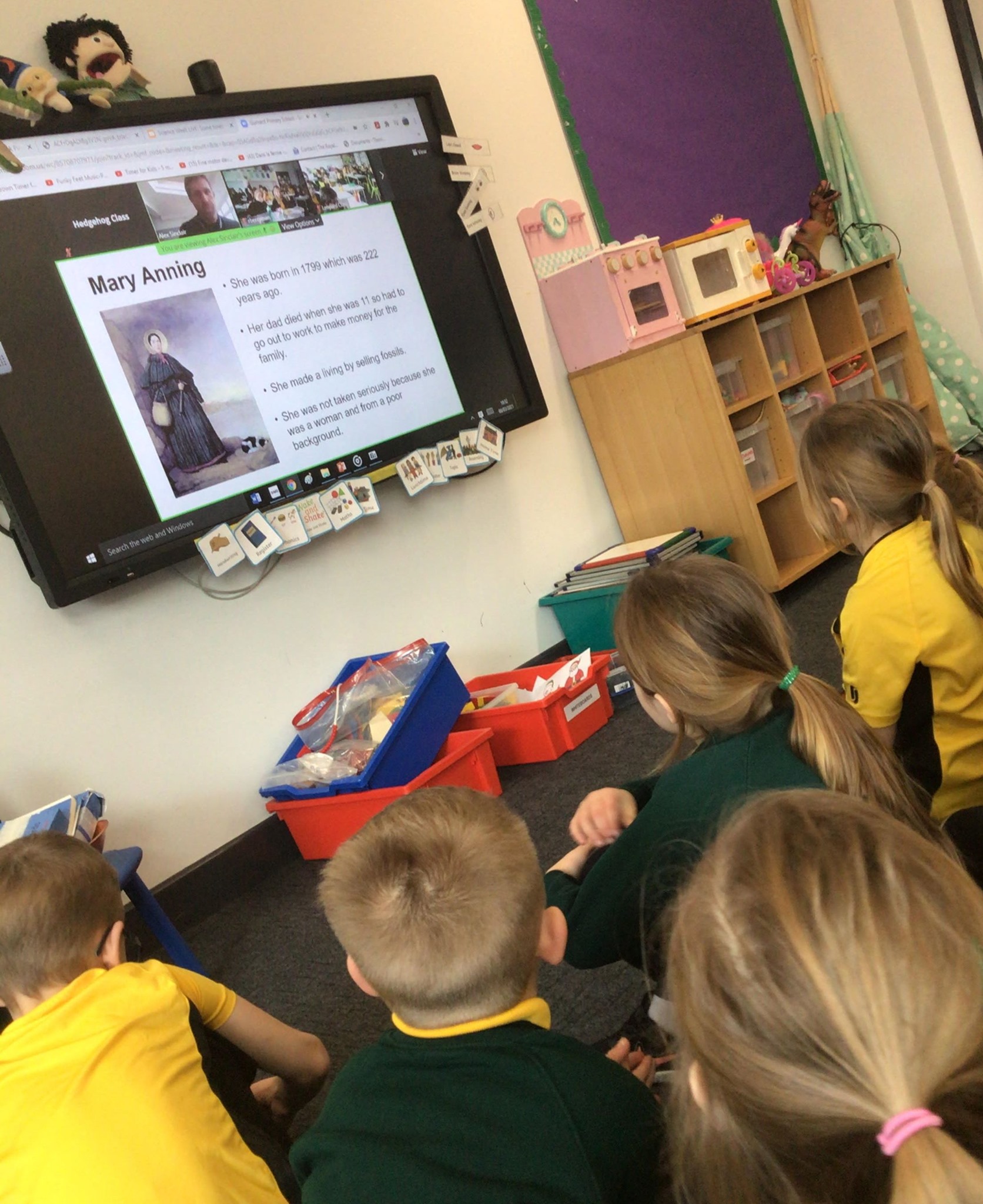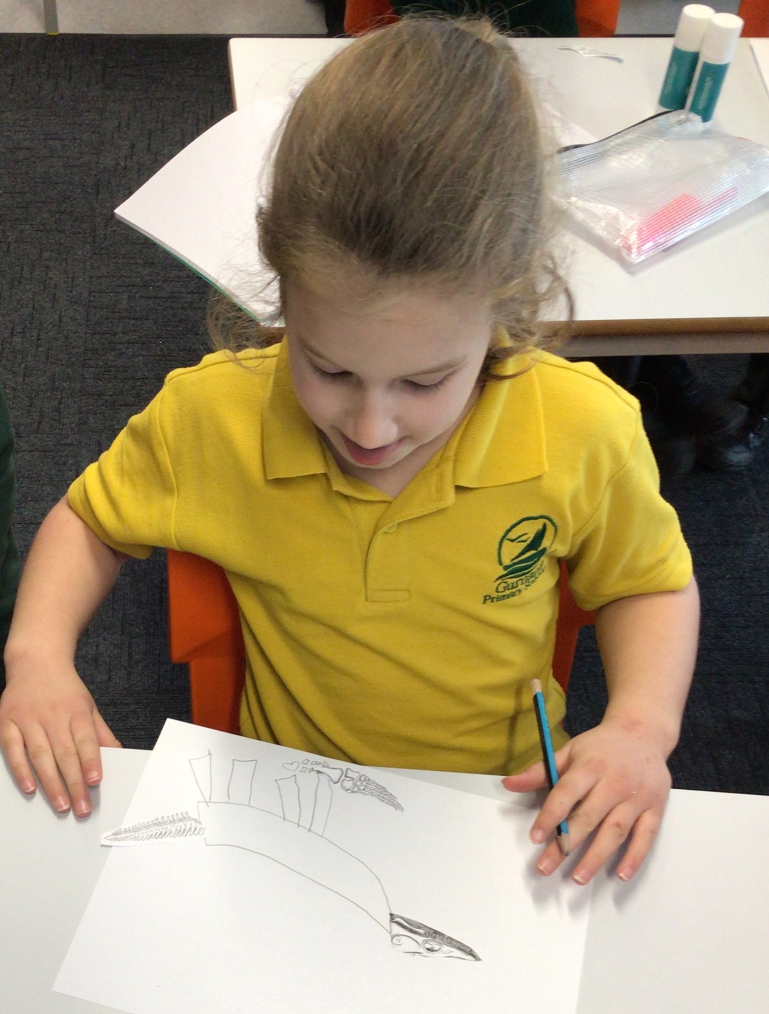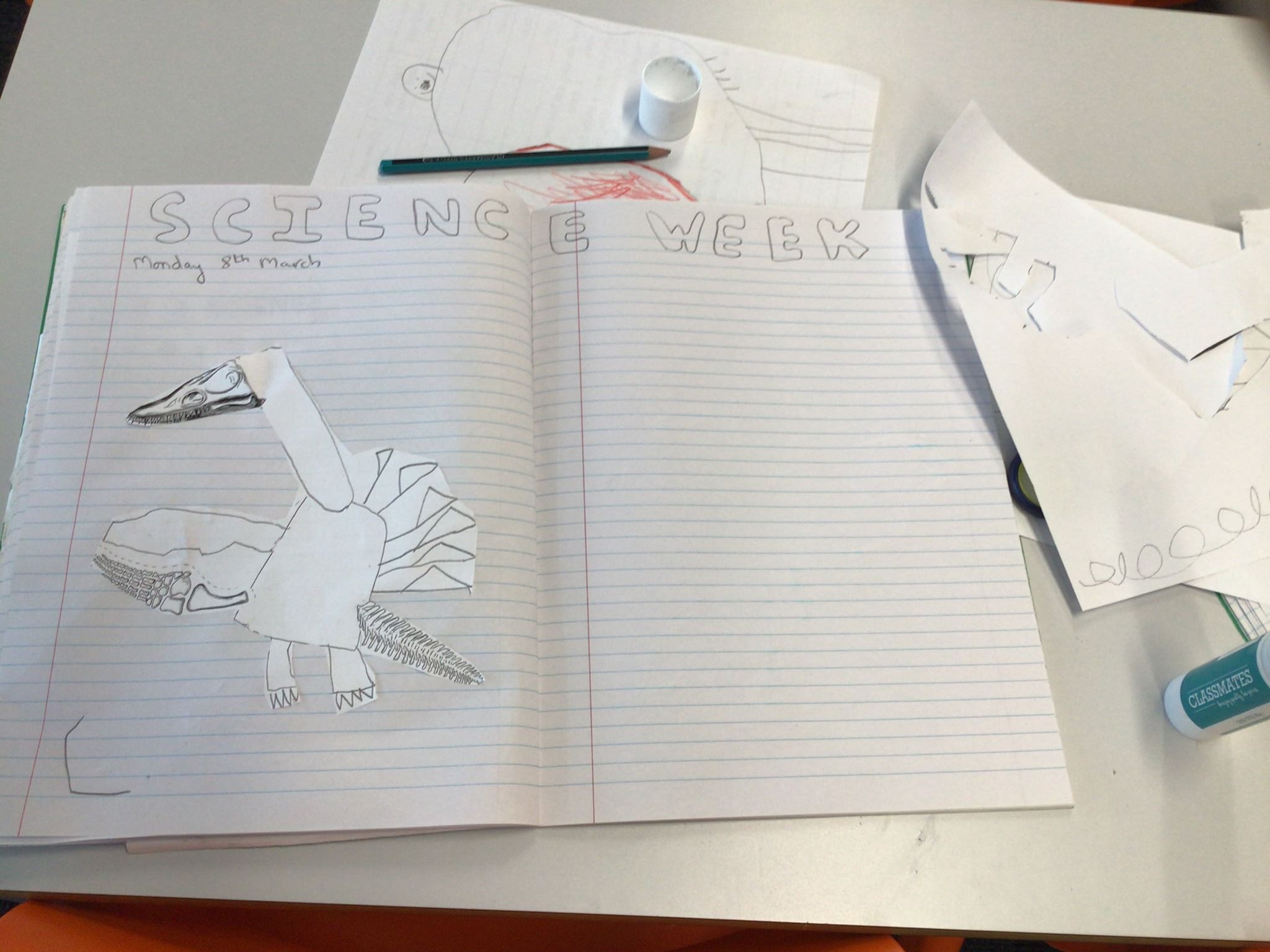 At 11am, we met Dr. Alex Sinclair from St Mary’s University in London – he told us all about Mary Anning and the importance of her life and the fossils she discovered. What was most interesting was that she was near to us, hunting for fossils on the Jurassic Coast! We then used pieces of a mystery fossil to inspire us to draw the whole creature, some of us had 1 piece, some had 2 and some had 3 – no surprises that those of us with 3 pieces were able to draw a more complete fossil!