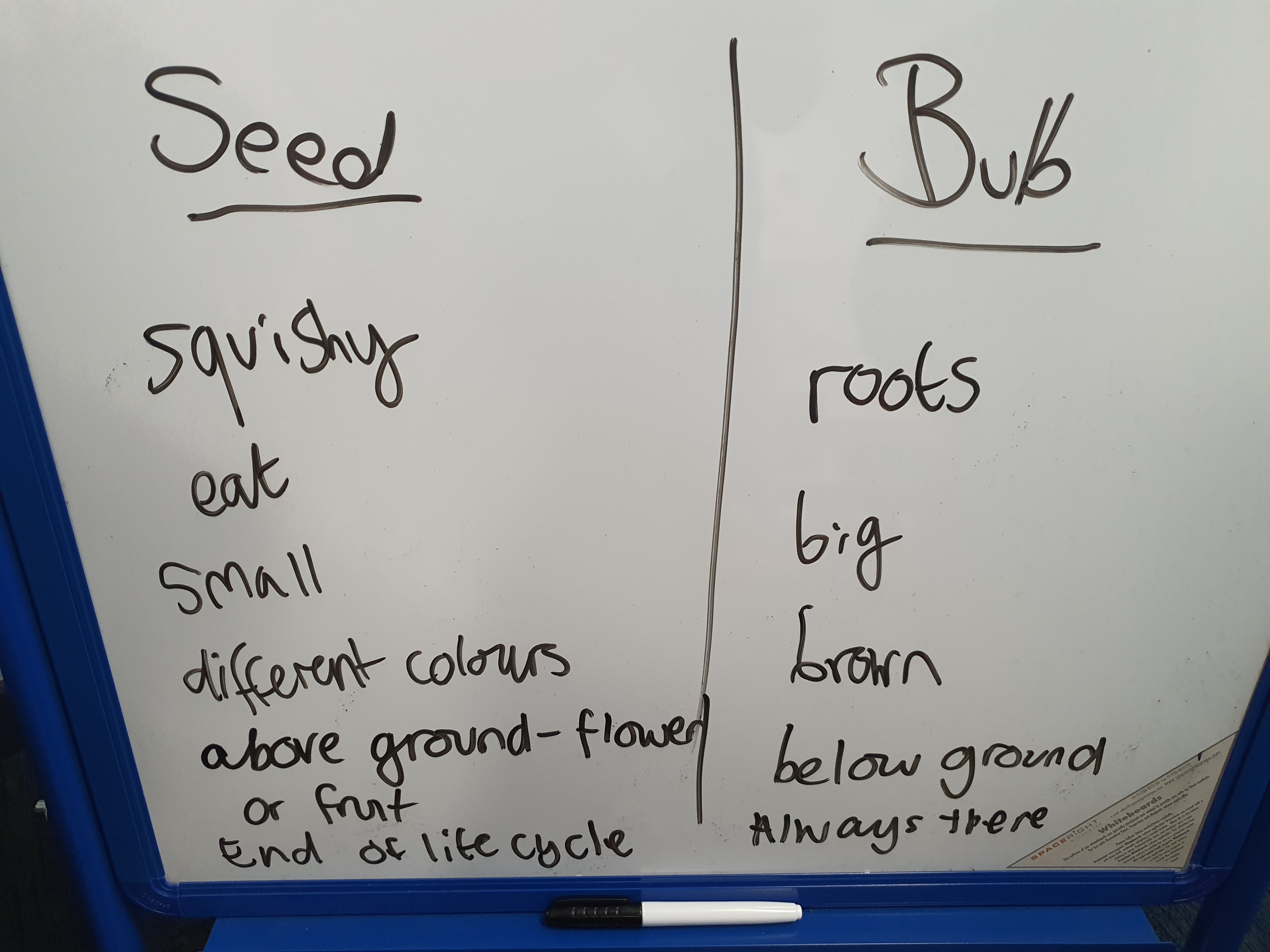 Bulbs – are generally bigger and softer and that they grow below ground. We also realised that they tend to have all the bits a plant needs inside them, like root backs and shoots/leaves. The are also present underground throughout a plants life cycle, unlike seeds.