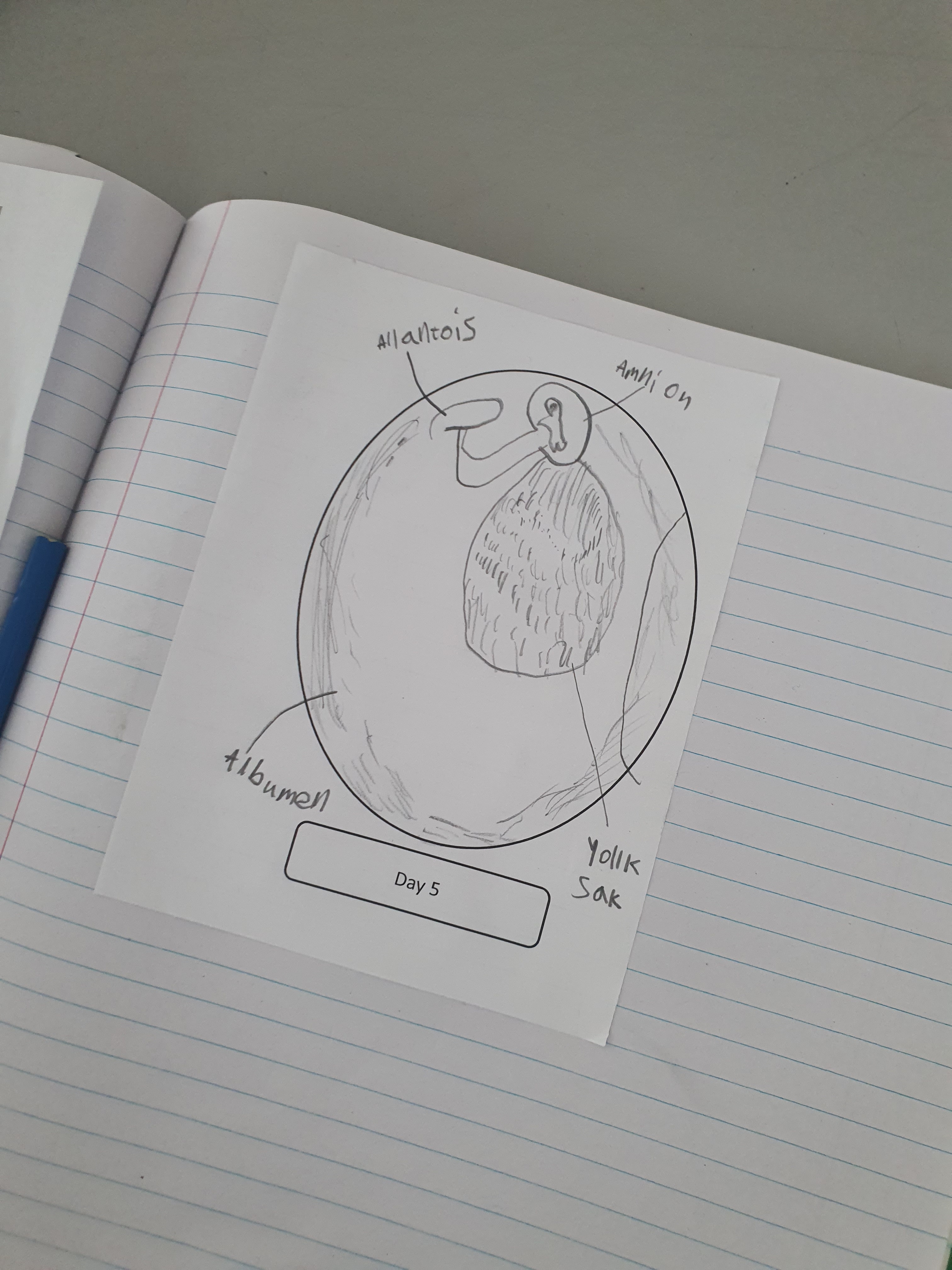 After learning all about the difference between a drawing and a scientific diagram, we observed our eggs, representing our observations through a scientific sketch. We also looked at the timeline of chick embryo development, deciding that our eggs were between 5 and 7 days old.