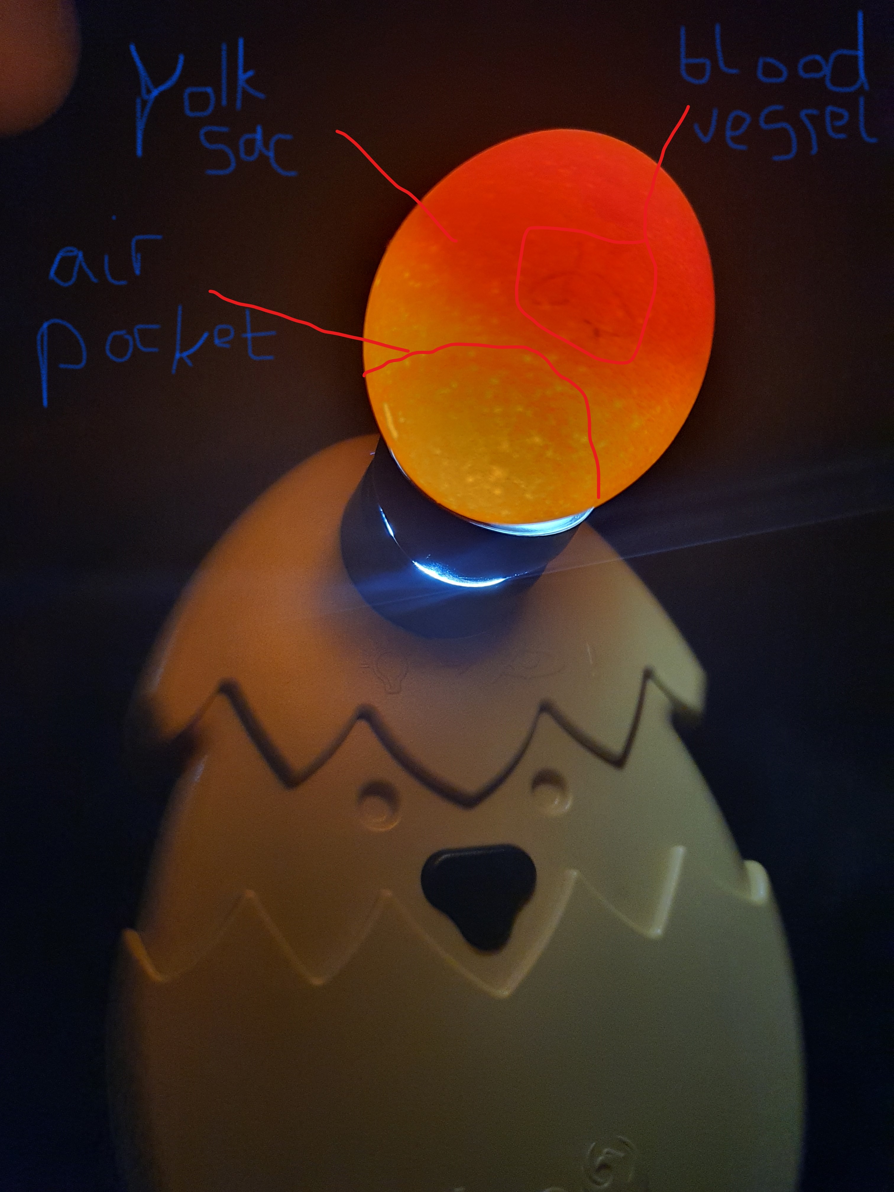 We then entered the dark den, and used a candler, to identify which of our 24 eggs were fertile, and which were not. It was clear to us quite quickly, how to find the air pocket, and how to locate the embryo and amnion in the yolk sac. In some of our eggs (the more developed) we could easily make out the darker network of blood vessels.